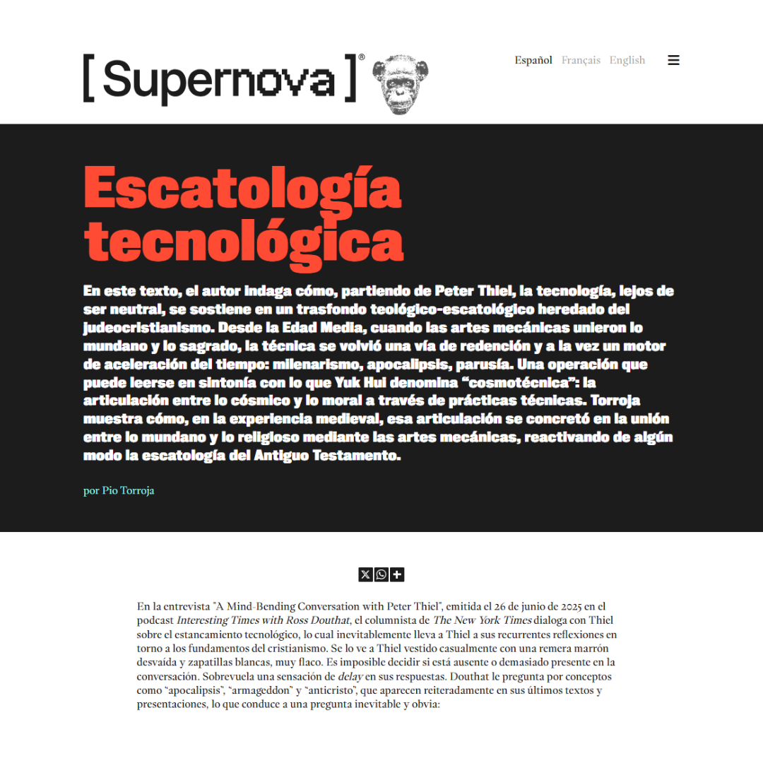 jul. 2025. Revista Supernova: En este texto, el autor indaga cómo, partiendo de Peter Thiel, la tecnología, lejos de ser neutral, se sostiene en un trasfondo teológico-escatológico heredado del judeocristianismo.